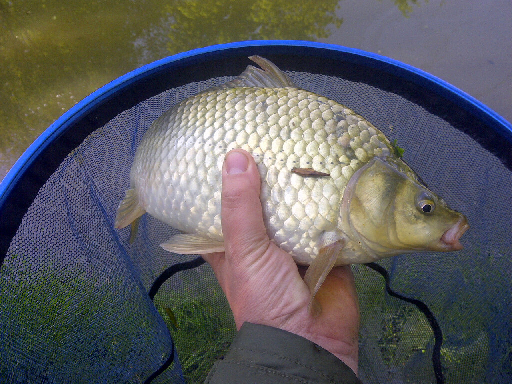 Wat mij opviel was dat alle vissen lekker dik waren, en 1 brasem liet zijn hom in het schepnet lopen, een bewijs dat zelfs op deze vijver die gemiddeld 1 meter 50 diep is de vissen nog niet afgepaaid zijn.